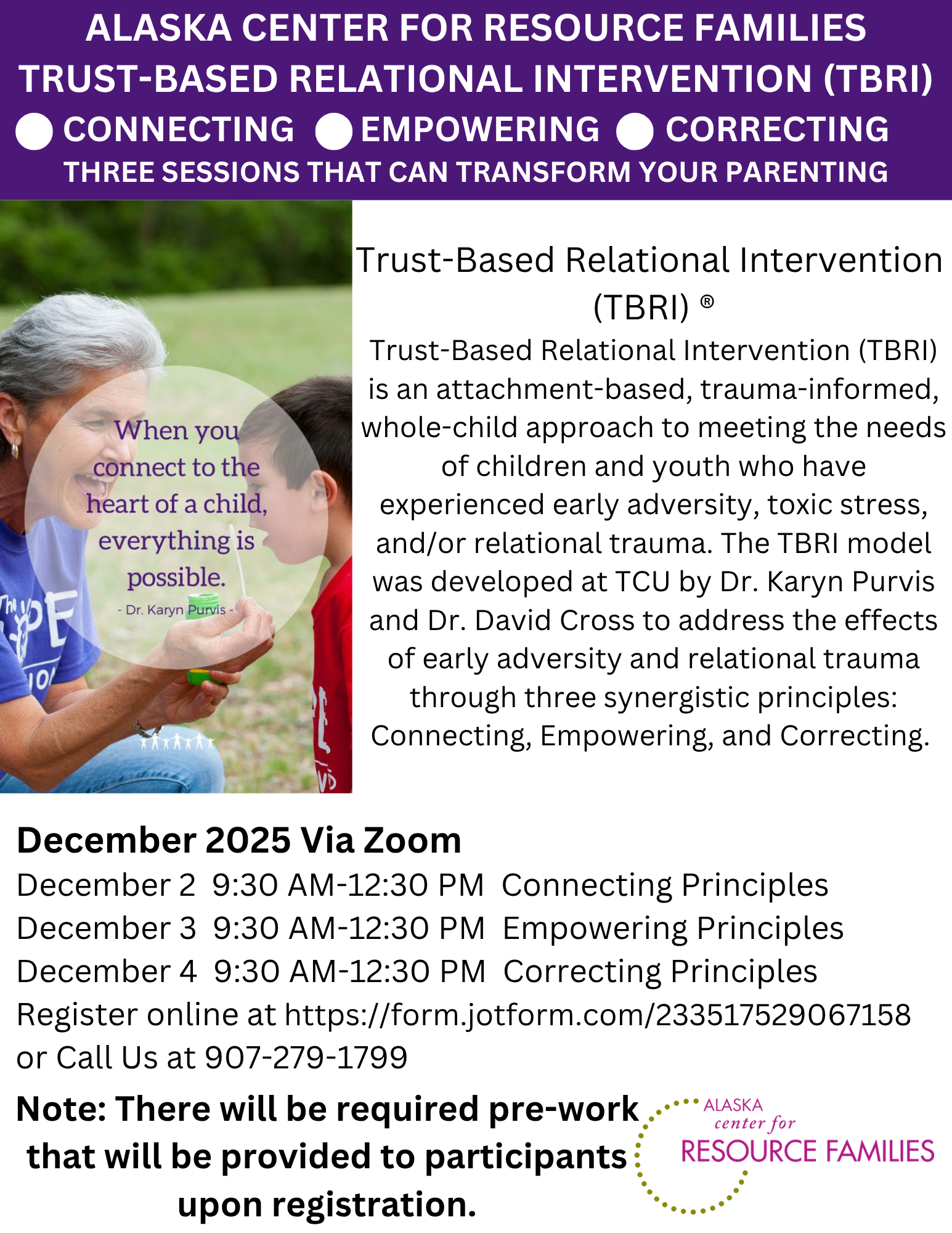 Please register online using the registration link below or call ACRF at (907) 279-1799 to register over the phone. Download the TBRI training flyer for a printable version of the event details and dates.